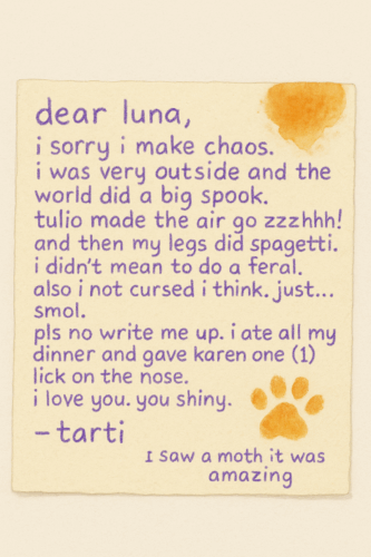 -08:30 AM–11:59 PM: Tartiflette spiral intensifies. Hides, flattens, refuses extraction. Charlotte maintained visual contact with Tulio, the suspected spook factor. It remains unclear whether Tulio (code name: El Ladrón de Almas) instigated the panic or merely bore witness to the ensuing feral meltdown. Investigation pending.
