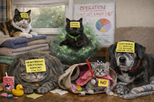 Willow’s reads: “LEAD NURSE. NO SNIFFING THE INCISION.” She accepts her role with calm dignity, already stationed next to the heating pad, watching the room like a stoic field medic.