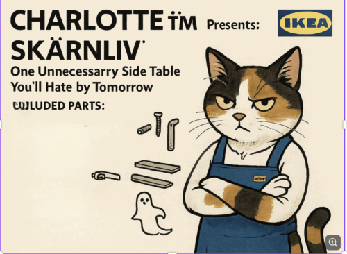 “Your table is crooked, your ego is bruised, and your cat is disappointed. You could have burned it. You could have left it on the curb and bought a crate instead. But noooo, you had to assemble the SKÄRNLIV. You summoned Yrldgün, disappointed Björn, and angered Scorchio. Also, I licked it, that’s my side table now. You can go cry on your futon”.
