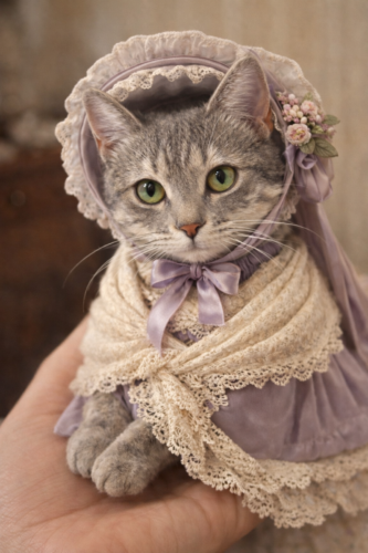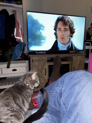Nestled under Karen’s arm, Tartiflette rises slowly into view, wrapped in a shawl she absolutely stole and wearing a bonnet perched on her head at a dangerous, historically accurate angle. Paws clasped, posture impeccable. She is rocking slightly side to side. Tarti is watching the screen, rapt. She shifts, huffs, mutters commentary under her breath in a horrendous fake British accent, clearly improvised and deeply offensive to any subject of His Majesty.